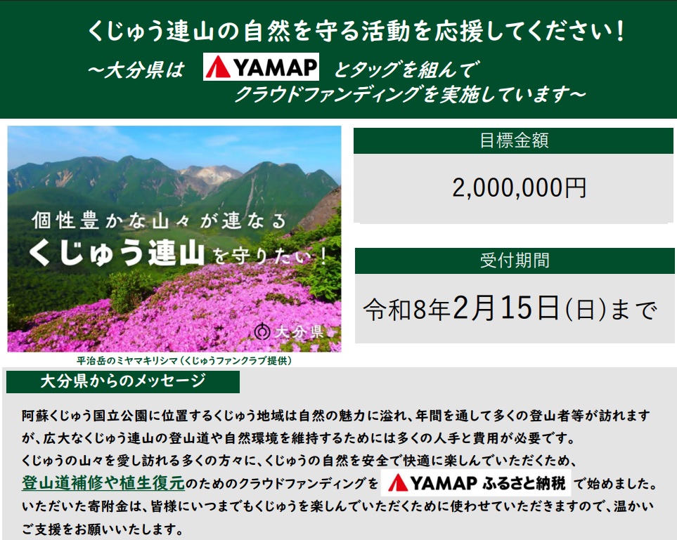 大分県によるくじゅう連山の登山道整備等のためのクラウドファンディング(YAMAPふるさと納税)がスタートしました!